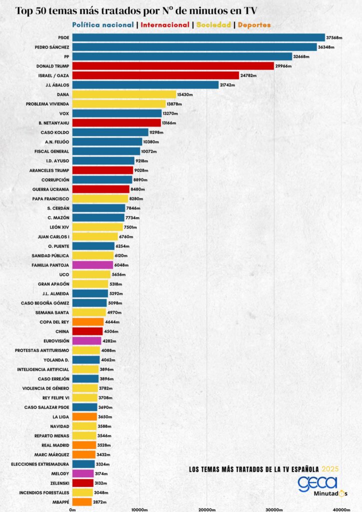 Te presentamos el informe «Los temas más tratados de la televisión española 2025». Basado en nuestra herramienta Minutados de GECA, hemos realizado un desglose granular de cada minuto emitido por los principales programas en abierto para visualizar los temas y personajes a los que se les dedicó más tiempo. Analizando un universo de 832.000 minutos de contenido y cruzando los datos de emisión con los índices de audiencia de Kantar Media, este estudio no solo cronometra la presencia en pantalla, sino que determina qué asuntos generaron un interés real en el espectador y cuáles simplemente ocuparon tiempo de parrilla.